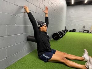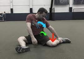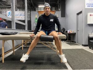 To assess hip range of motion, sit on the edge of a table and place a foam roller between your knees and aim to rotate your heels outward (without lifting / hiking your hips off the table). We are looking for about 40-45 degrees of internal rotation (as seen on this athlete’s right hip) or near symmetrical motion side to side. If limitations persist it is advised for the individual to perform the stretch in the right picture. The set up is 90-90 hip flexion and knee flexion, focus on rotating your torso over the trail leg while applying pressure into the ground.