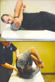 Perform the same set up as for shoulder flexion but instead aim to rotate the arm while at 90 degrees. Limitations will present themselves due to bony changes that occur (humeral retroversion) however the overarching vision should be that external rotation (going back) on the throwing arm should exceed that of the non-throwing arm and that the total motion is near symmetrical. If limitations in internal rotation persist it is advised that the individual perform the modified cross-body stretch as seen in the dual image, and if external rotation deficits persist that the individual perform the stretch / soft-tissue release as seen in the third picture.